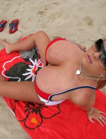 One of the hottest dolls in the town is exactly this busty blonde babe and she knows that. She likes to go to the beach where she sunbathes while everyone stares at her massive tits. After that, she goes home and washes her tits while she poses